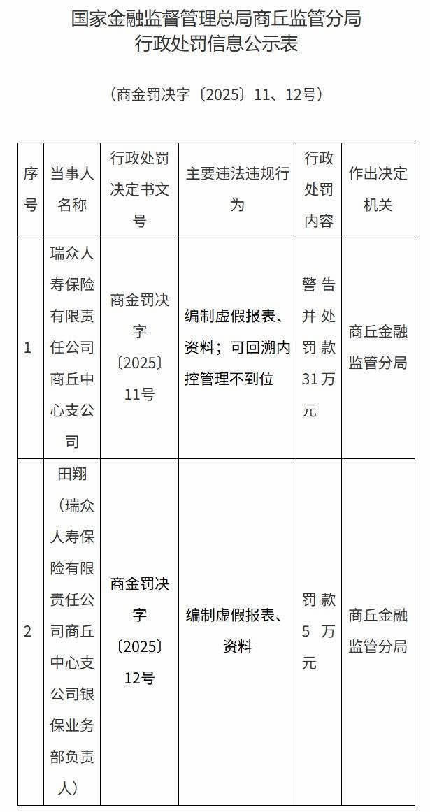 同时,瑞众人寿保险有限责任公司商丘中心支公司银保业务部负责人田翔被罚5万元。