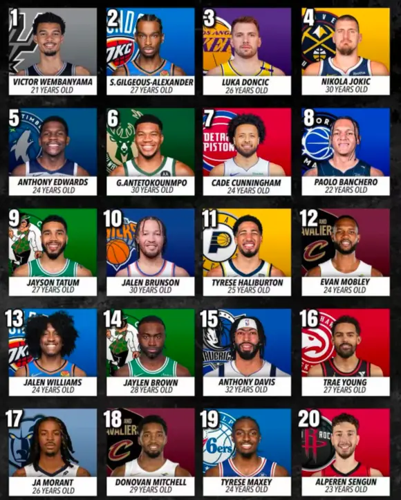 1.21岁文班亚马、2.27岁亚历山大、3.26岁东契奇、4.30岁约基奇、5.24岁爱德华兹、6.30岁扬尼斯、7.24岁坎宁安、8.22岁班凯罗、9.27岁塔图姆、10.30岁布伦森;