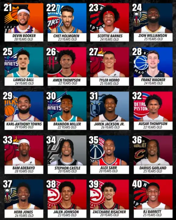 21.28岁布克、22.23岁霍姆格伦、23.24岁巴恩斯、24.25岁胖虎、25.24岁三球、26.22岁阿门、27.25岁希罗、28.24岁小瓦格纳、29.29岁唐斯、30.22岁米勒;